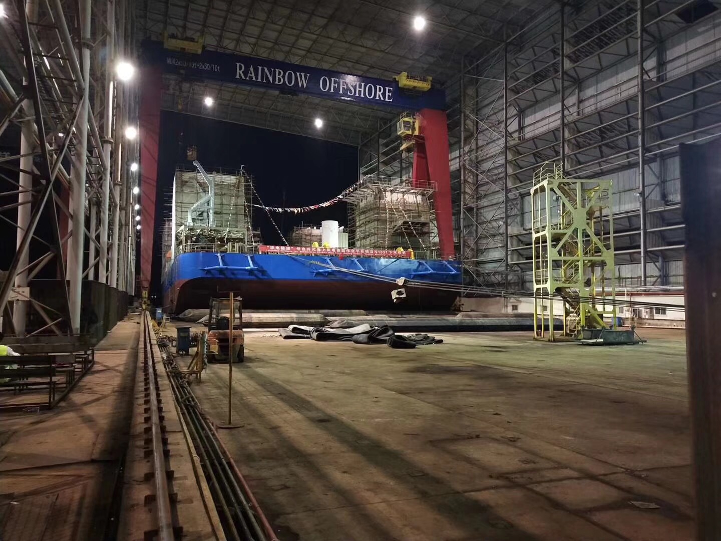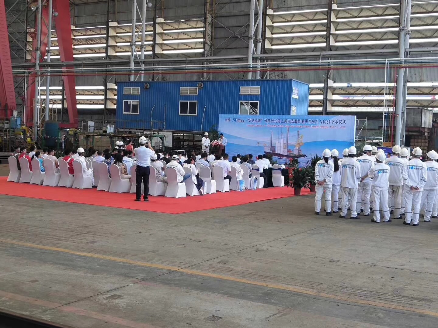 熱烈祝賀由南通豪通船務在潤邦海洋總包主船體搭載工程的“華電穩(wěn)強”號自升式海上風電安裝作業(yè)平臺于2018年8月28日中午順利下水!